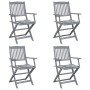 Este moderno juego de sillas de comedor de madera con cojines da un toque de estilo natural al jardín, la terraza o el patio. Este juego de sillas plegables es una gran opción para comer. Estas sillas de comedor están hechas de madera maciza de acacia, una madera dura tropical, por lo que son resistentes a la intemperie y muy duraderas. La madera maciza de acacia posee la fuerza para soportar pesos y para aguantar el desgaste y el paso del tiempo. La superficie en gris deslavado se limpia fácilmente con un paño húmedo. Las sillas se pueden plegar para ahorrar espacio cuando no se usen. Además, los cojines incluidos proporcionan un plus de comodidad mientras descansas o comes. Cada cojín cuenta con dos juegos de cuerdas para fijarlo firmemente en la silla. Nota: Para prolongar la vida útil de los muebles de exterior, te recomendamos que los limpies con regularidad y no los dejes al aire libre sin protección innecesariamente.Limpieza: Usa una solución de jabón suaveAlmacenamiento: Si es posible, guarda el producto en un lugar fresco y seco en el interior. Si el producto se almacena al aire libre, protégelo con una funda impermeable. Limpia y seca el exceso de agua o nieve de las superficies planas después de una lluvia o nevada. Permite la ventilación para evitar daños relacionados con la humedad.