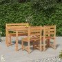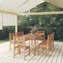 Este juego de comedor para jardín de madera, con un diseño elegante y moderno, será una excelente opción para comer o relajarse en el jardín. Madera de teca maciza: La madera de teca maciza es un hermoso material natural. Ha sido secada al horno y después lijada finamente para darle un aspecto muy suave. La madera de teca es conocida por su excepcional fuerza y resistencia a la intemperie.Tablero robusto: Esta mesa de comedor te proporciona un tablero robusto. Puedes colocar aperitivos, bebidas y cualquiera de tus adornos favoritos.Resistente al agua: Gracias a ser resistente al agua y a su aspecto clásico, puedes colocar el juego de muebles de jardín en cualquier lugar de tu dulce hogar, tanto fuera como dentro.Cómodo asiento: Cada silla de comedor tiene un respaldo, por lo que resultan comodísimas. Nota:Cada producto viene con un manual de montaje en la caja para facilitar el montaje.Para prolongar la vida de tus muebles de exterior, te recomendamos que los protejas con una funda impermeable.