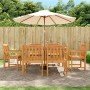 ¡Disfruta de una buena comida o cena en el espacio al aire libre de tu casa con este juego de comedor de madera para jardín! Material de primera calidad: La madera maciza de acacia es un bonito material natural. La madera de acacia es una madera dura tropical, densa, robusta y duradera.Práctica superficie: La resistente superficie de la mesa de comedor ofrece espacio para colocar aperitivos, fruteros, objetos decorativos y otras cosas.Asiento cómodo: La silla de comedor está diseñada con un respaldo y reposabrazos para ofrecerte un cómodo asiento. Información útil:Para asegurarte de que tus muebles de exterior se mantengan hermosos, recomendamos protegerlos con una funda impermeable.