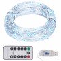 Esta cadena LED es perfecta para usar como complemento de iluminación en cualquier proyecto decorativo. Es adecuado para Navidad, fiestas, bodas y otras fiestas. La cadena tiene 300 LEDs, creando un rendimiento de iluminación de color blanco cálido. Tiene 8 efectos de iluminación diferentes: Modo de combinación, ondas, modo secuencial, modo de brillo lento, parpadeo, modo de decoloración lenta, giro e iluminación continua. Gracias al control remoto (pilas no incluidas. Use batería de botón CR2025) incluido, puedes usar la luz fácilmente. La cadena de luces con alambre de cobre se puede doblar fácilmente en cualquier forma que quieras. Es un gran complemento decorativo para iluminar espacios de interior y exterior, como jardines, vallas, portones, árboles de navidad, etc. Nota: El producto tiene un conector USB, pero la fuente de alimentación USB de 5V certificada no está incluida.