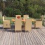 ¡Crea una estética atractiva y cohesionada en el espacio al aire libre de tu casa con este juego de comedor para jardín! La mesa de comedor está hecha de madera maciza de acacia, lo que la hace robusta y estable. La superficie con acabado de aceite también la hace adecuada para uso en exteriores. Con una estructura de acero cubierto con ratán PE resistente a la intemperie, las sillas de comedor son resistentes y fáciles de limpiar. Los reposabrazos están bellamente decorados con madera maciza de acacia, lo que aporta una sensación de encanto rústico. El respaldo se puede reclinar y el reposapiés subir al mismo tiempo tirando del botón lateral. Los cojines acolchados gruesos también añaden comodidad adicional al asiento en tu tiempo de descanso. Nota: Para prolongar la vida útil de los muebles de exterior, te recomendamos que los limpies con regularidad y no los dejes al aire libre sin protección innecesariamente.Limpiar: Usa una solución de jabón suaveAlmacenamiento: Si es posible, guarda el producto en un lugar fresco y seco en el interior. Si el producto se almacena al aire libre, protégelo con una funda impermeable. Limpia y seca el exceso de agua o nieve de las superficies planas después de una lluvia o nevada. Permite la ventilación para evitar daños relacionados con la humedad.