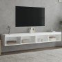 Con un diseño moderno y práctico, este mueble para la TV con luces LED se convertirá en el centro de atención de la estancia. Material duradero: La madera de ingeniería tiene una calidad excepcional y una superficie lisa, y también cuenta con fuerza, estabilidad y resistencia a la humedad. Hecho de madera de ingeniería, este soporte de TV es robusto y duradero.Amplio espacio de almacenaje: El mueble de TV ofrece un amplio espacio para mantener bien organizados y al alcance reproductores de DVD, receptores, discos y otros objetos pequeños.Luces LED RGB: Este mueble cuenta con luces LED RGB, con diferentes menús para cambiar el color de las luces y permitir que el color se ajuste de forma automática.Diseño de pared: Este mueble se puede colgar en la pared para conseguir espacio de almacenamiento extra. De esta manera, puedes maximizar el espacio en el suelo y mantener la zona despejada. Información útil:Los tornillos y los tacos para el interior de la pared no están incluidos. Recomendamos encontrar y utilizar tornillos y tacos adecuados específicamente para las paredes. Si no estás seguro, puedes consultar con un profesional. Lee y sigue cada paso de las instrucciones.El producto tiene un conector USB que necesita una fuente de alimentación USB certificada de 5 V (no incluida).