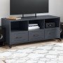 Este mueble para TV es sencillo y práctico, y se adapta perfectamente a tu salón. Material duradero: El acero es un material muy duro y fuerte. Ofrece robustez y estabilidad. Las placas de acero laminadas en frío tienen una buena calidad superficial y una alta precisión dimensional.Función expositora: La resistente superficie del mueble es ideal para exhibir objetos decorativos como marcos y plantas.Amplio almacenaje: El mueble de TV ofrece 3 cajones y 3 estantes que lo convierten en un lugar ideal para guardar todas las revistas, DVD y otros objetos.Fácil mantenimiento: La mesa de centro con superficie resistente a las manchas es fácil de limpiar y puedes mantener la mesa con el mejor aspecto sin esfuerzo.Fácil de mover: Este armario tiene 4 ruedas, lo que hace que se mueva con flexibilidad y se estacione de manera estable en cualquier momento.